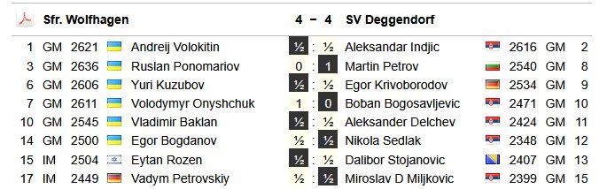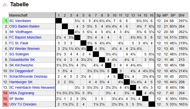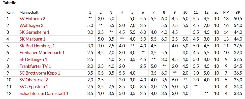 Auch das Hessenliga-Team benötigt in der letzten Runde am 26. April ein kleines Wunder, um noch den Platz an der Sonne zu erobern. Zwar wurde in der vorletzten Runde Gernsheim sicher mit 5.5 zu 2.5 bezwungen, doch auch der Tabellenführer aus Hofheim kam zu einem gleich hohen Sieg gegen die Freibauern aus Mörlenbach. So liegen alle Hoffnungen auf den Marburgern, die in der letzten Runde Hofheim besiegen müssten, einen Sieg unsererseits gegen Dettingen vorausgesetzt.