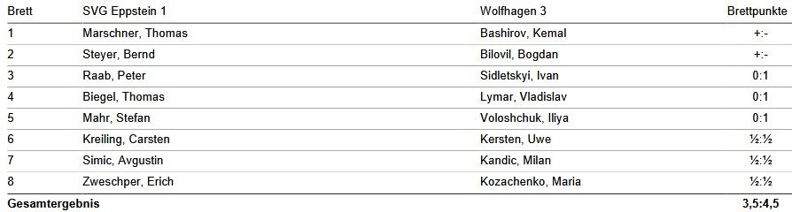 Zeitgleich musste das Hessenligateam im südhessischen Eppstein antreten, hatte jedoch mit Krankmeldungen und der Deutschen Bahn schon vor dem eigentlichen Wettkampf zwei übermächtige Gegner, was dazu führte, dass wir nur mit sechs Spielern antreten konnten. Derart geschwächt war die Kampfmoral um so größer und am Ende gelang tatsächlich ein knapper, aber nicht unverdienter Sieg.